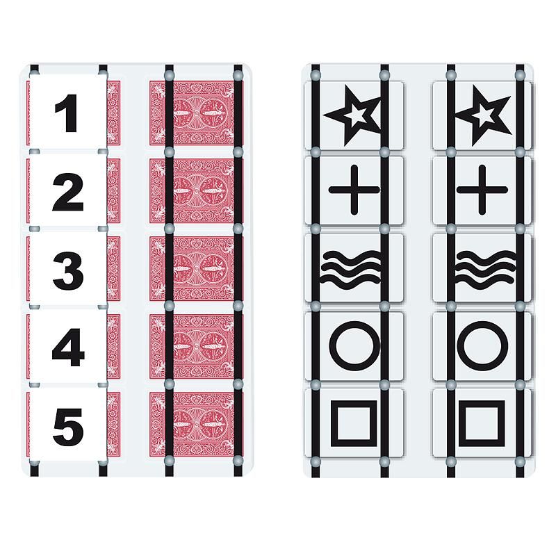 The magician shows two sets of ESP cards, either set is handed to a spectator to mix. The remaining set placed individually under the elastic holders as the Magician's prediction. The spectator now hands cards one by one and they are placed into randomly selected positions accordingly. When the frame is turned over, both sets of cards are seen to match perfectly.