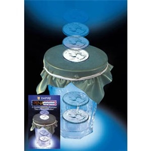 The original trick (invented by Lubor Fiedler in the early 1960's) was for a coin to penetrate a rubber sheet. Since then, many other ideas have been created using this principle. But the most popular still is to have a coin is sitting on top of rubber sheet that's stretched over the mouth of a glass. A spectator is asked to simply push the coin, as this is done, the coin incredibly and instantly penetrates the rubber sheet and falls into the glass. Everything is left with the spectators for full examination.