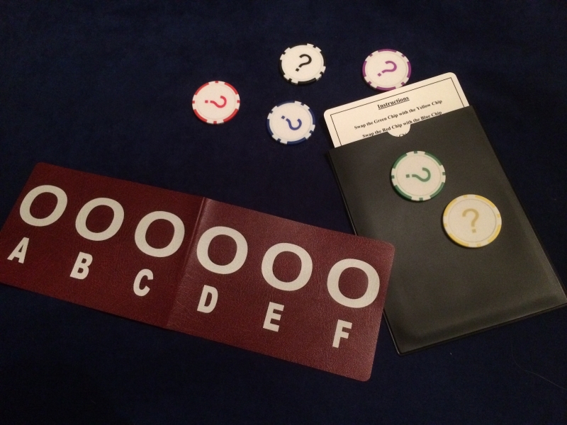 Using six Poker Chips (each a different colour), an instruction card and a small mat. The mat has letters A - F printed on it, each marking a circled position. The spectator is handed the Poker Chips and instructed to place them on the circles in a random order. This done, both magician and spectator read the printed instruction sheet, and follow its directions. During a novel process of elimination, the spectator hands the magician individual Poker Chips - when turned over, each chip has a value in £s printed on it. The final instruction reads for the spectator to turn over the remaining chip and claim their prize. Alas, when revealed, the final Poker Chip has only a value of Zero pounds!