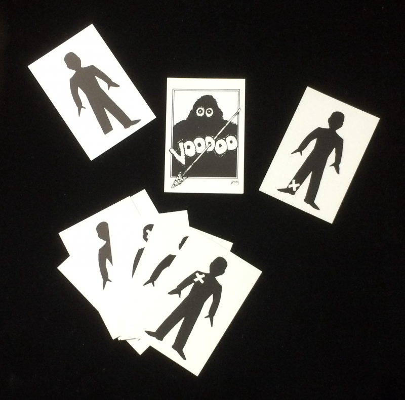 A most unusual pocket trick, one that'll stick in your audience's memory and keep them talking. To an appropriate patter about the power of Voodoo, the magician displays various cards, each with the outline of a human figure printed on it. Each also has an X marked on a different part of its anatomy. One card does not have the X and is placed aside face down, the others are given to a spectator to mix and select one. The spectator's choice is turned up and the position of the X is noted, then the previously placed aside card is turned face up, amazingly the body part in the appropriate position is now missing.